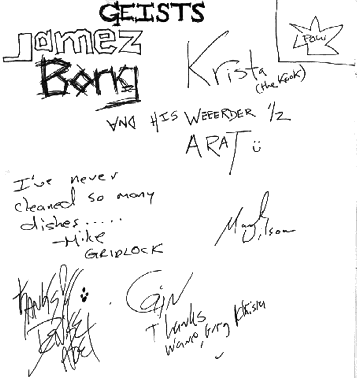 jamez bong / tara (arat) / krista / mike / mark wilson / denise noel / cain